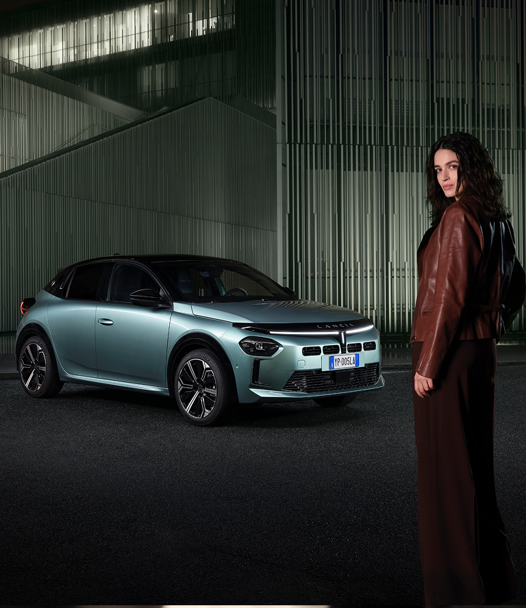 El frontal reinterpreta la icónica parrilla de Lancia con forma de cáliz, con tres haces de LED para facilitar su reconocimiento. En la parte trasera, los faros de LED rinden homenaje al Lancia Stratos.