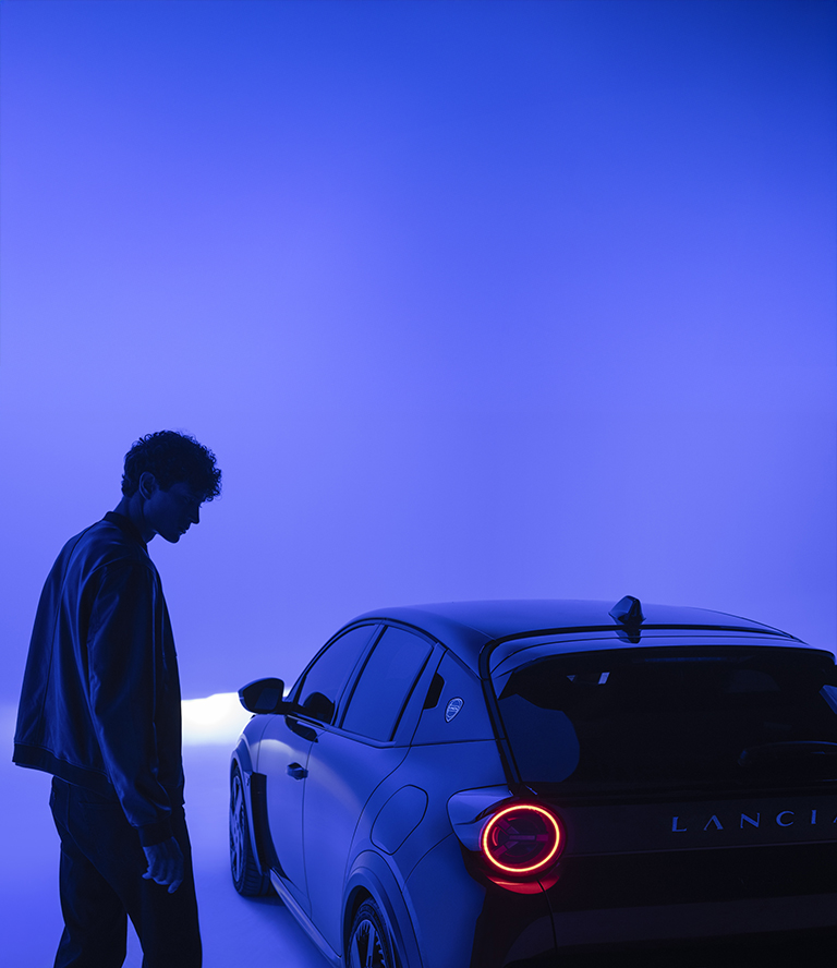El frontal reinterpreta la icónica parrilla de Lancia con forma de cáliz, con tres haces de LED para facilitar su reconocimiento. En la parte trasera, los faros de LED rinden homenaje al Lancia Stratos.