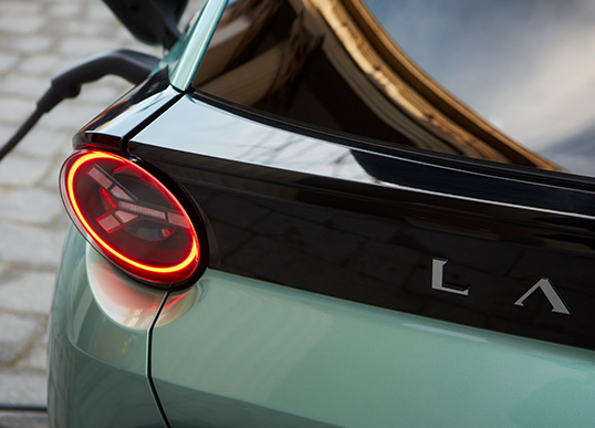 El frontal reinterpreta la histórica parrilla de Lancia: el cáliz, con tres haces de LED que hacen que el vehículos eléctricos sea reconocible tanto de día como de noche. En la parte trasera, los faros LED son un claro homenaje al Lancia Stratos, una leyenda de los rallies.