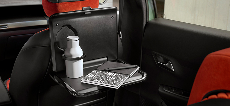 Unido a los asientos delanteros, le ofrecen una pequeña mesa con portabotellas ideal para disfrutar de un largo viaje mientras sigue trabajando o viendo su serie favorita.