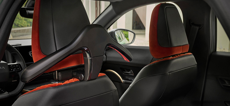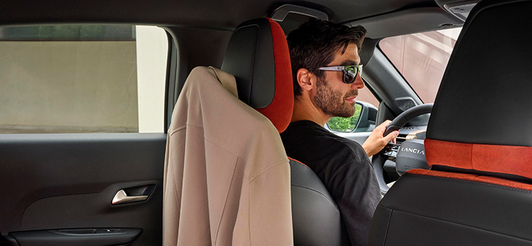 Colgado detrás de los reposacabezas delanteros de su Lancia Ypsilon, este accesorio está preparado para sujetar chaquetas o vestidos y mantener su estilo en perfecta forma.